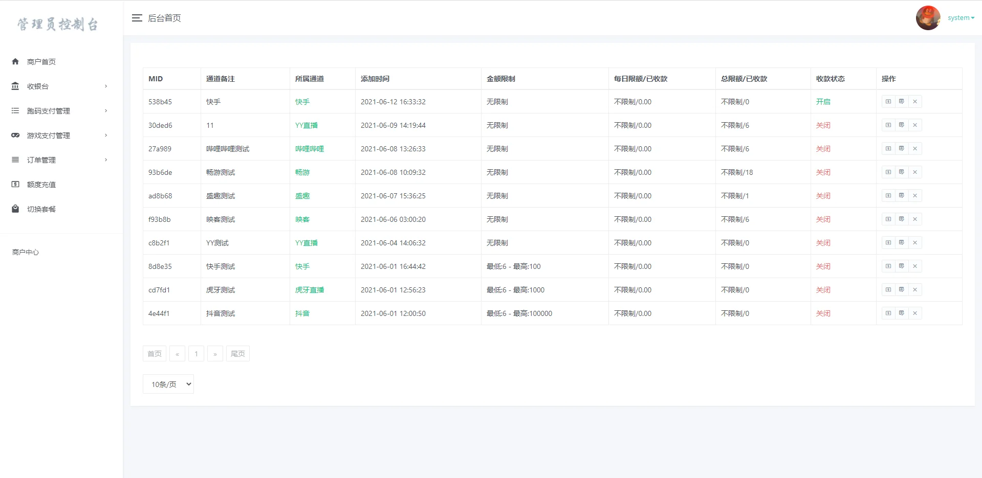 功能介绍:商户额度控制 充值额度设置 订单时间设置 商户购买套餐设置 注册设置 域名设置(单独通道域名) 公告设置 商户通道管理 ….